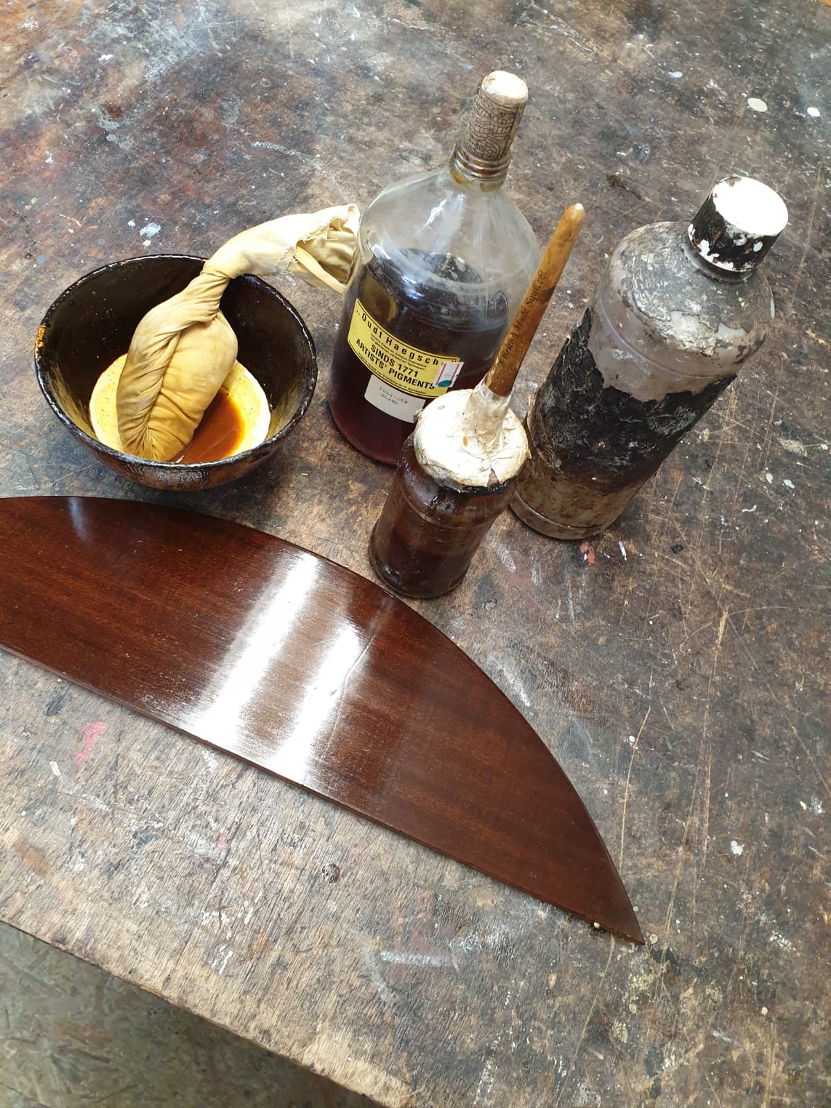 Een afwerktechniek met shellac politoer op basis van methylalcohol waarbij de structuur van het hout een diepe glans krijgt op bijvoorbeeld mahoniehouten meubelen.